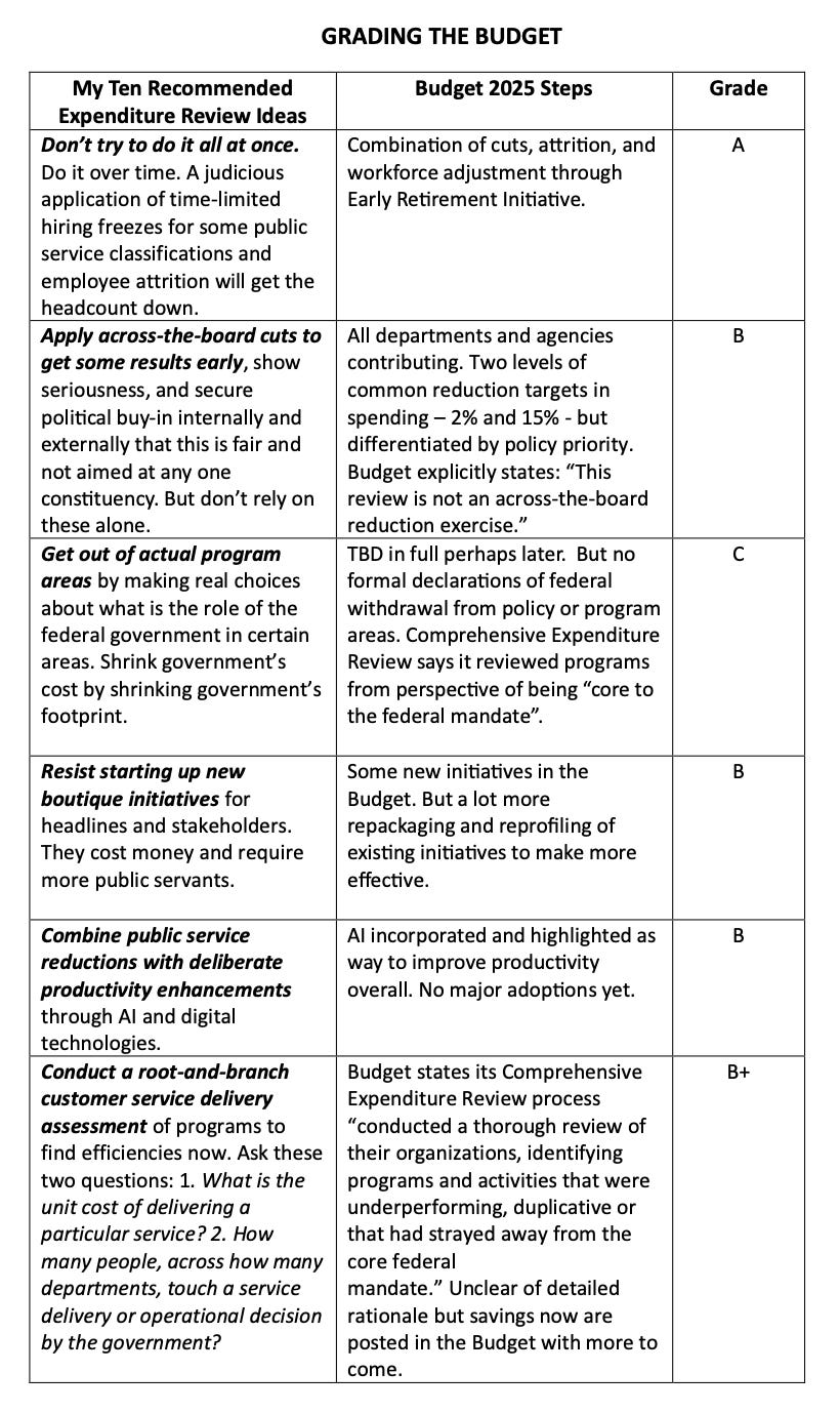 Back in early August, I compared the DOGE approach in the US with what should be done in Canada instead. I offered 10 recommendations. Below, I grade the Budget’s response to them. Your grading may vary, and execution is what really matters, but not bad, overall.