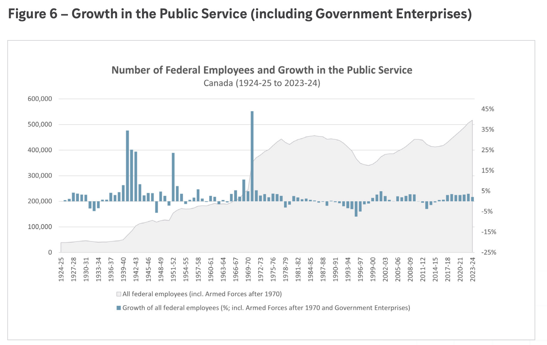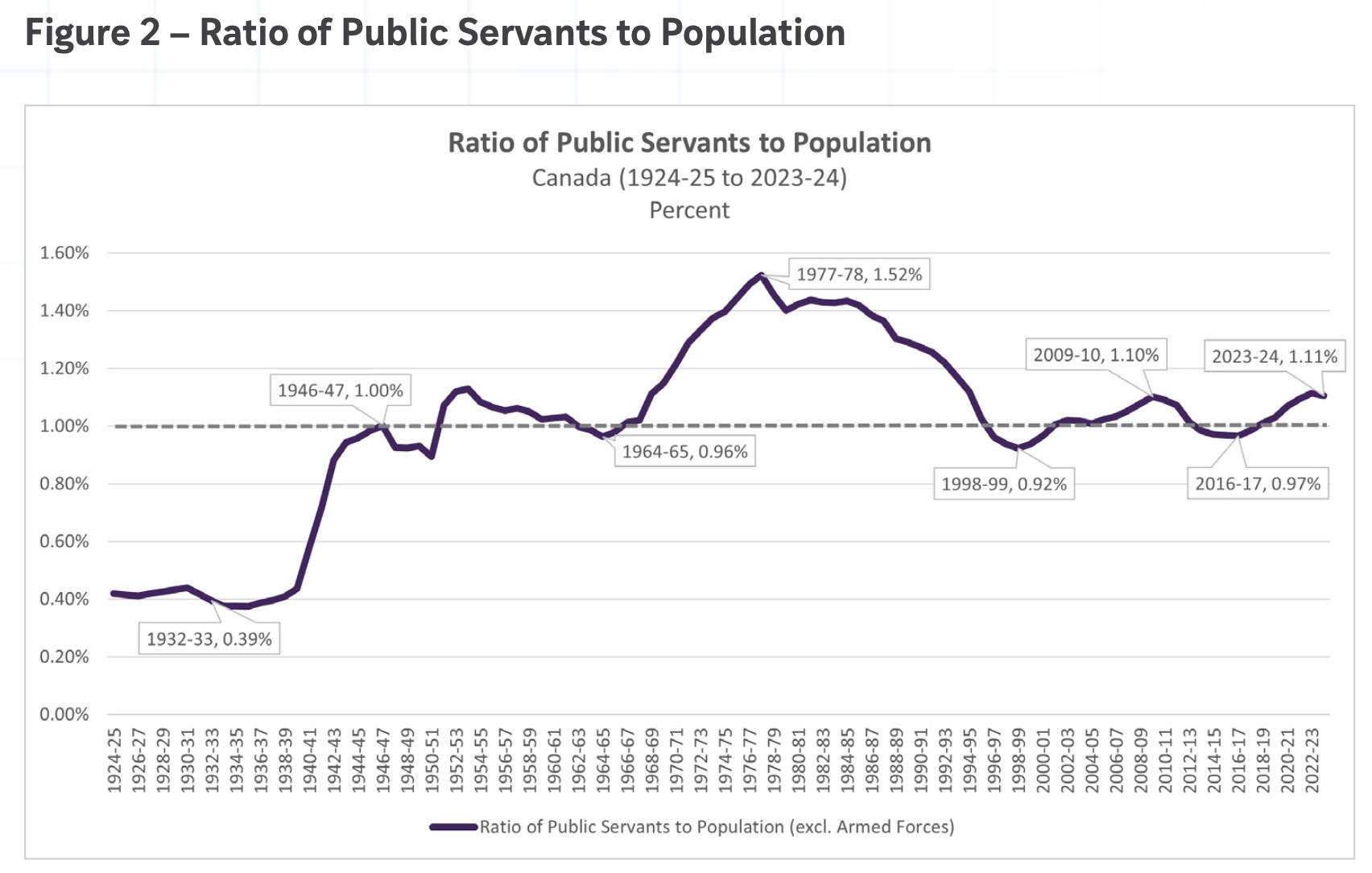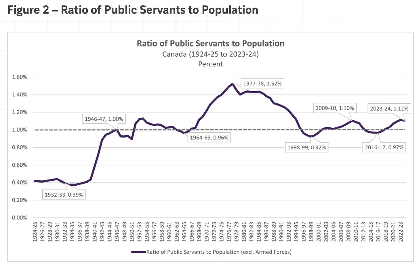Big ups in the Second World War period; another upswing in the Liberal governments of Lester Pearson and Pierre Elliott Trudeau; incremental downsizing in the Brian Mulroney years initiated by the Nielsen Task Force; a serious cut in the Chretien years which he proceeded to reverse somewhat as time went on; status quo under Stephen Harper until the 2008/09 Great Recession; steady growth under Justin Trudeau; and, well, here we are today.