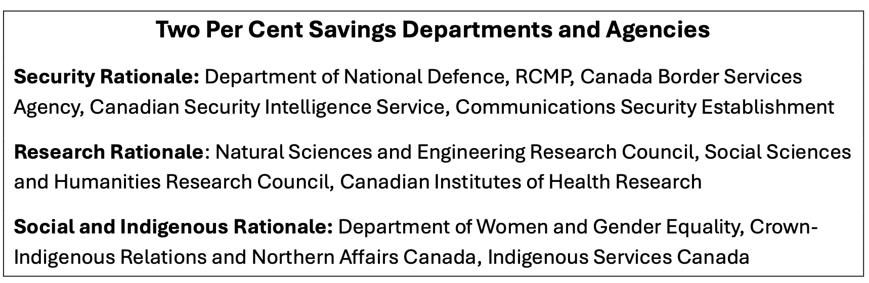 Spare the Pain, not Share It: While most departments and agencies are expected to find 15% savings, some are let off lightly with only a 2% savings target. This reflects a specific political and policy choice by the government to spare, not share the pain. These are: