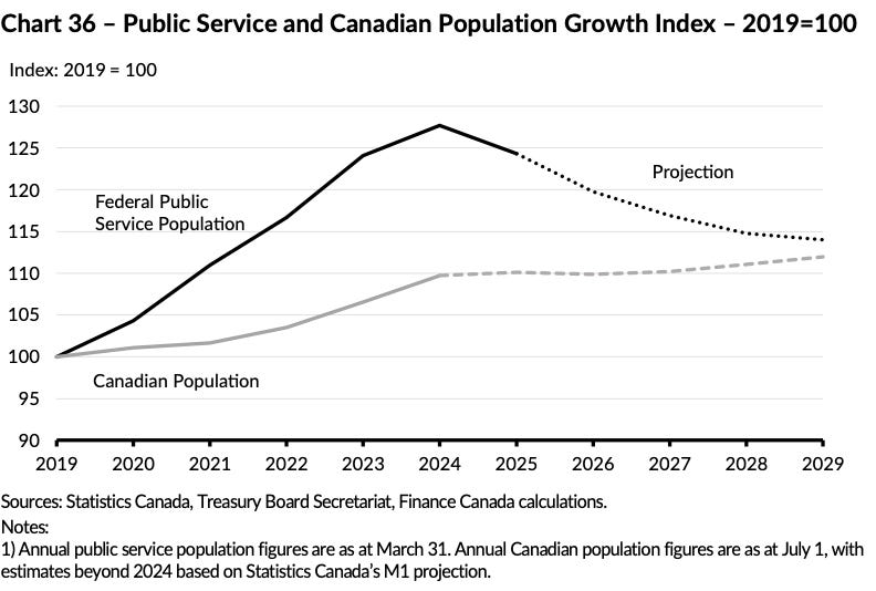First, the big picture and a big chart from the Budget to illustrate. It shows the size, growth and budgeted reduction in the number of public servants indexed against the size and growth of Canada’s overall population. The working thesis is that they should match. You should not have a public service that is proportionally larger than the population it serves. You can see that we have that now and will yet till the end of this decade at least.