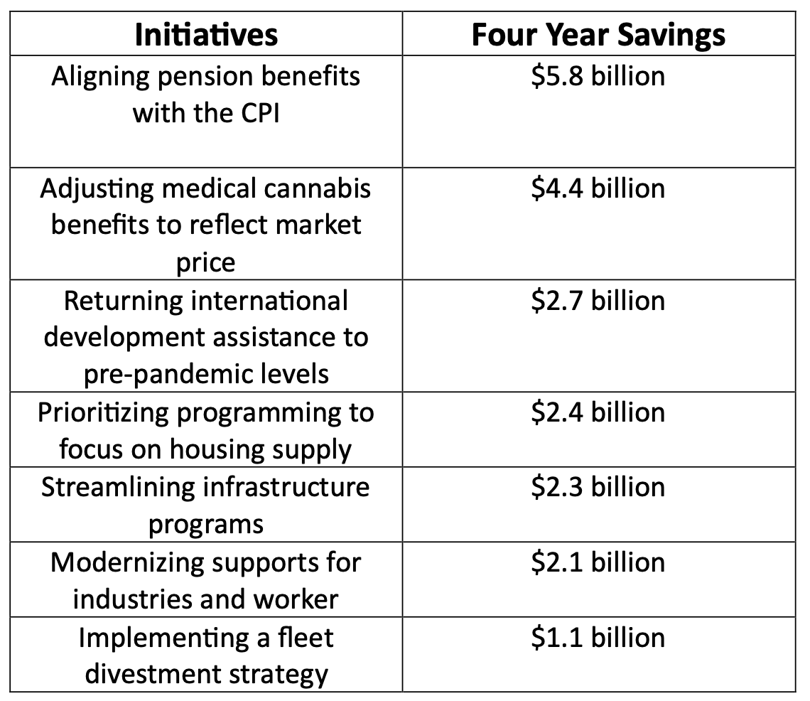 To top it off, the Budget anticipates savings of only $600 million over 4 years for what is called “Streamlining Government Operations" -”to reduce inefficiencies in daily operations and consolidate back-office operations”, as they put it. The real heavy lifting lies with the other two themes, with almost half of the planned savings - $20.8 billion - coming from just 7 initiatives. These are: